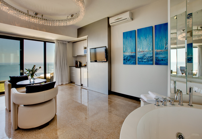 Bedroom with a extravagant round Jacuzzi, separate bathroom (WC, shower, basin), built-in kitchenette (MW, fridge, extractor, cutlery, crockery frying pan no stove). Full sea view from the balcony and the bedroom. King size bed (can be used as twin as well). Flat screen TV, telephone, air-con, Wifi, electronic safe. The size of the suite is approximately 32sqm plus a 28sqm balcony.