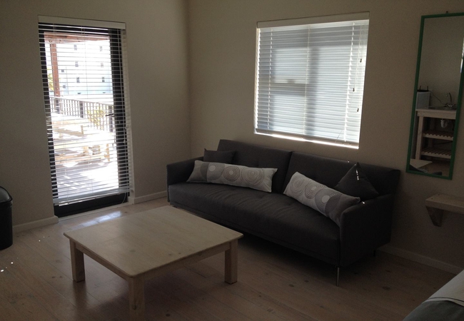 The apartment sleeps 2 adults and 1 child (max 15 yrs) and is furnished with a double bed and a sleeper couch. The private en-suite bathroom is fitted with a shower, basin and toilet. There is a cupboard, a hairdryer, a coffee table and kitchenette including a small fridge.