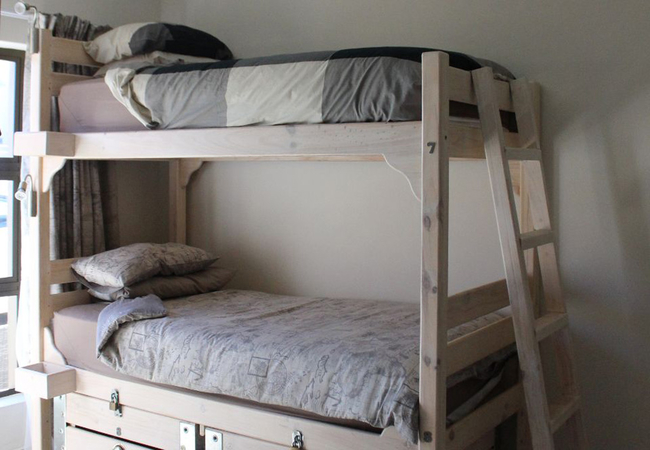 A budget dorm room that sleeps six guests and us furnished with two single/twin bed and two bunk beds. The room is situated on the ground floor. The modern bathroom is to be shared with the other budget bunk bed rooms and consists of 4 toilets, 4 showers and 3 wash basins.