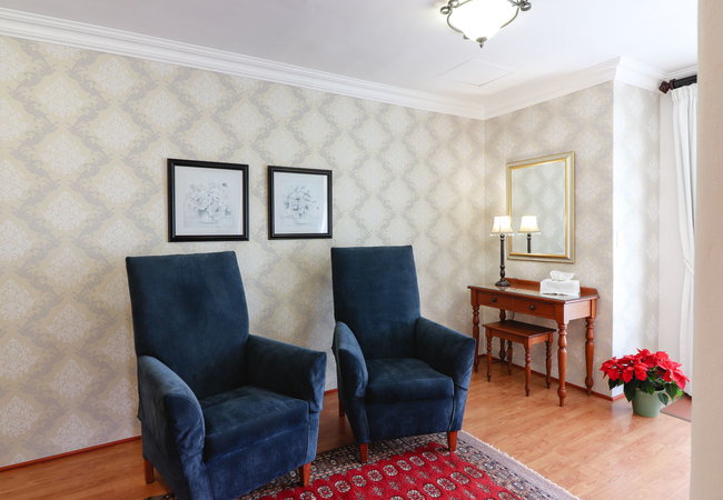 Spacious suite can be made into two twin or a king size bed, with balcony. Beautiful en-suite bathroom. Each bedroom has a TV, bar fridge, heater, fan, tea tray, safe, toiletries and hair dryer. All bathrooms are equipped with heated towel rails and some under floor heating.