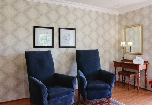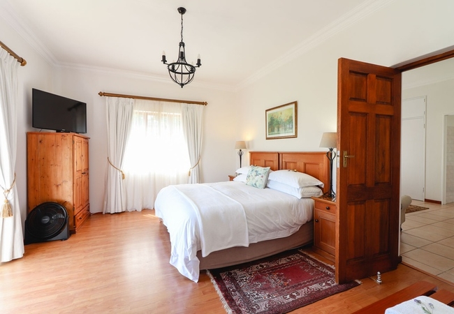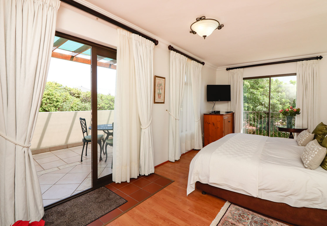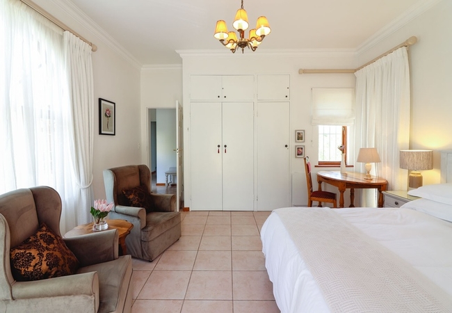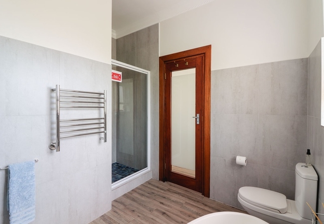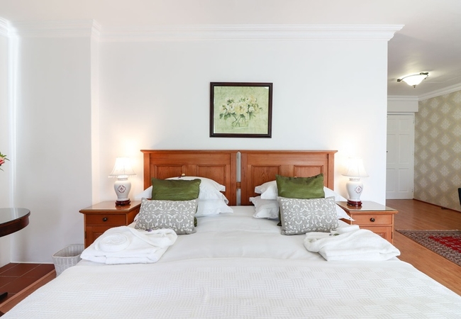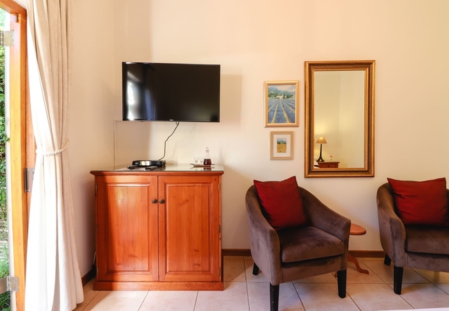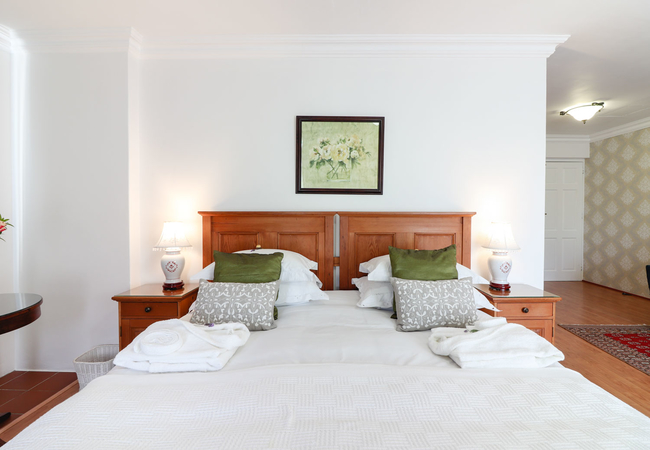 This north-facing suite has views of the Clovelly Mountains and consists of a spacious bedroom(with a Juliet Balcony). This elegant room boasts an en-suite shower and toilet as well as a separate lounge. Each bedroom has a TV, bar fridge, heater, fan, tea tray, safe, toiletries and hair dryer. All bathrooms are equipped with heated towel rails and some under floor heating.
