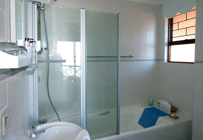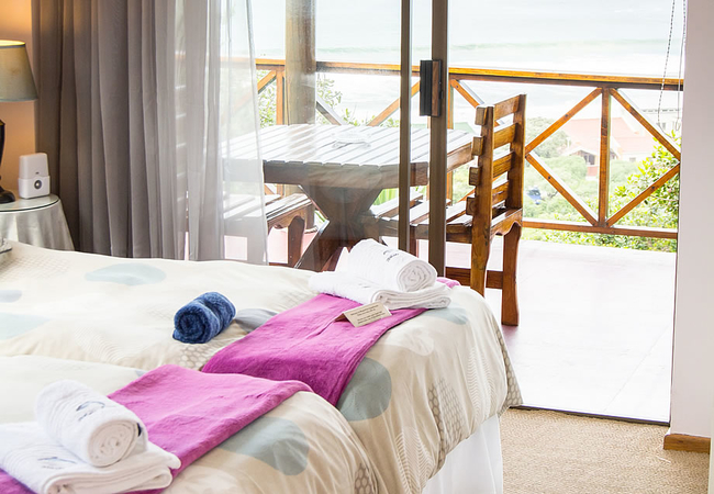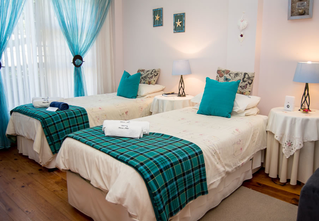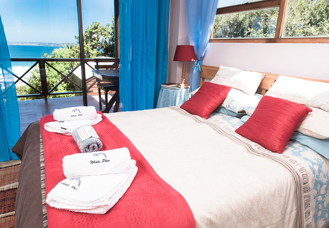 The Whale Room is furnished with twin beds (two singles). The en-suite bathroom is equipped with a shower over bath tub. Fully equipped including TV and mini bar. Ocean view with direct exits to balcony and dining room. Serviced daily. Non-smoking. From your room, balcony or sundeck spot whales in season, dolphins frolicking the waves and plenty of garden birds all year round.