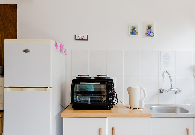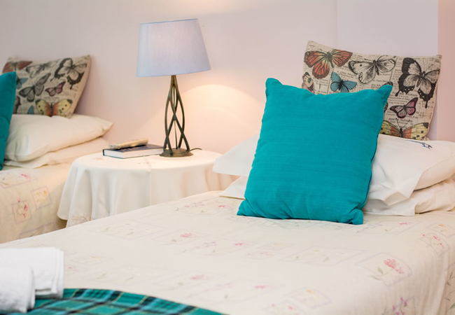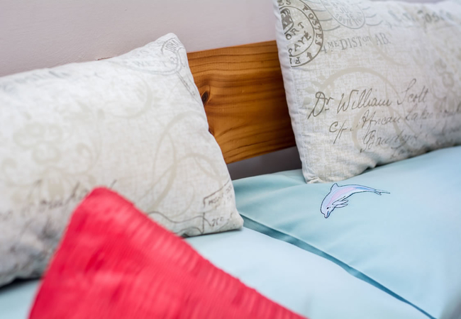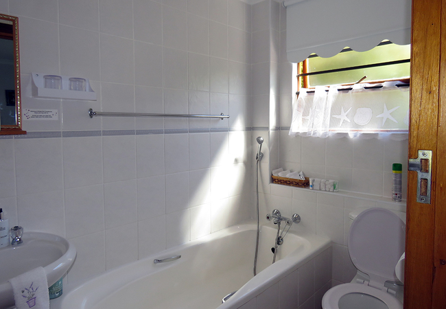 The Oyster Room is furnished with twin beds (two singles). The en-suite bathroom is equipped with a hand shower over tub. There is a fully equipped kitchenette and TV and mini bar. Serviced daily. Non-smoking. No sea view. From the balcony or sundeck you can spot whales in season, dolphins frolicking the waves and plenty of garden birds all year round.