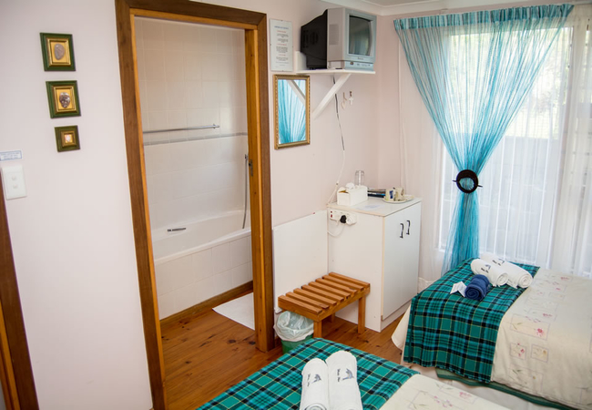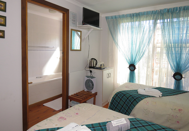 This room has two single beds and an en-suite bathroom with a hand shower over the tub. The room also has a TV.