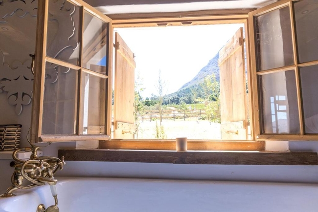 A beautiful, quaint French-inspired cottage set on a quiet country road, yet just minutes from the heart of Franschhoek. Surrounded by vineyards and nestled beneath the mountains, the cottage is shaded by two ancient oak trees, with free-roaming chickens.