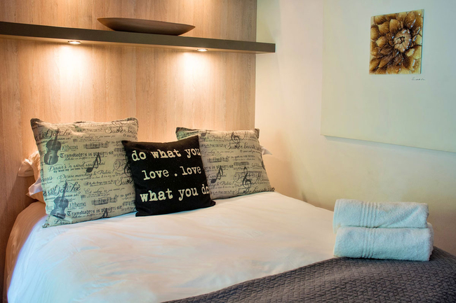 Tastefully decorated with high-quality furnishings, the apartment boasts a comfortable double bed adorned with crisp white linens and towels. Additional amenities include a hairdryer, a lockable safe, and an electric blanket for added comfort. Guests will also enjoy complimentary bathroom products.