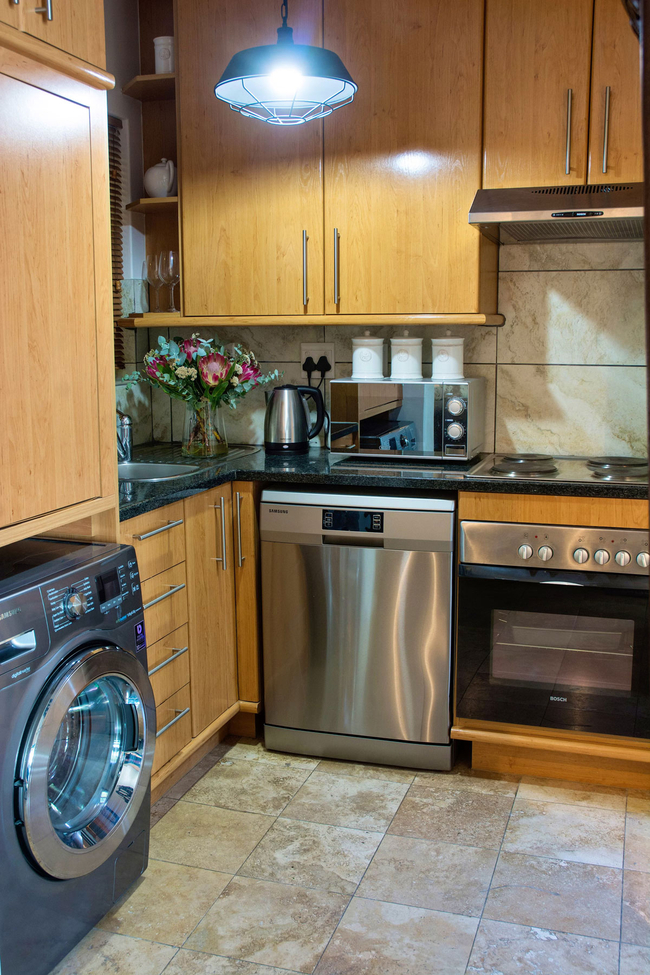 The kitchen is fully equipped for self-catering, featuring a Nespresso machine, a dishwasher, and a washer/dryer combo, ensuring a hassle-free stay.
