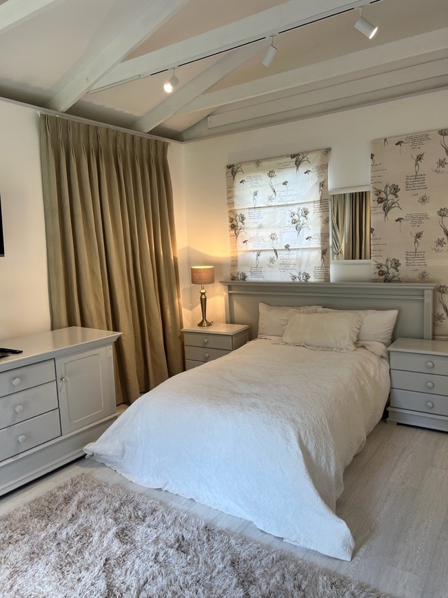 This is a luxuriously large restful space on the upper level of the guesthouse. It is light and airy and tastefully decorated in shades of white. Good for honeymooners or pure self indulgence. Double glass doors open onto a large balcony, where one can enjoy breakfast at the café style table and chairs, or sundowners, or simply sunbathe on the loungers and swing seat. Enjoy magnificent views of the treed garden and huge pool, and wonderous mountain back drop, and the glittering night lights of Newlands and Claremont. The bed is a sumptuous King Extra length, and very comfortably fitted with feather duvet and plenty of pillows, a comforter and electric blanket in winter. The large dressing table can double up as a desk. Equipped with the basics for simple self-catering and food preparation: kettle, microwave, egg boiler, toaster, sandwich maker. Full luxurious bath and shower en suite, with gowns slippers, and generous bathroom amenities. Under carpet heating, central fan plus heat pump for heating or cooling. Comfy couch for “feet up” TV viewing. Flat screen TV with DSTV. Fibre WiFi.