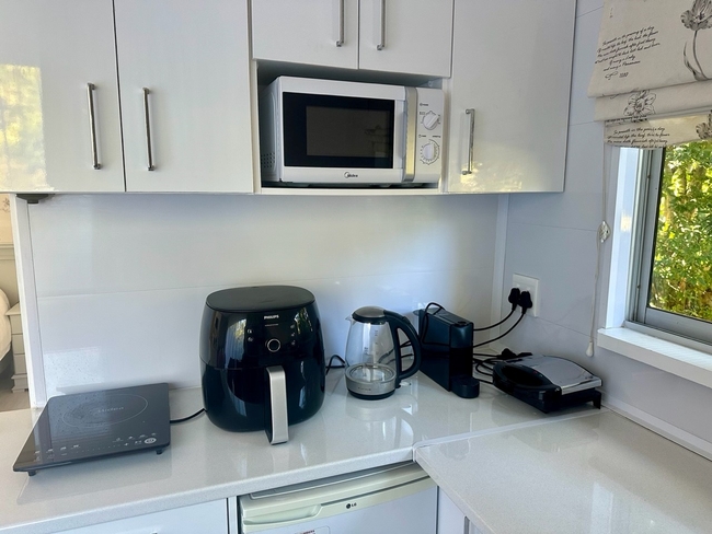 This private, charming, old world and very comfortable suite consists of 3 rooms: The bedroom with double bed; a full bathroom with a small bath and overhead shower; and a separate kitchen/ study/ lounge area. The Bedroom has a double bed, TV, Heater, Fan, cupboard and mirrors. There is a door from the kitchen to the outside from the kitchen which can serve as a separate entrance. The suite is fully tiled and decorated in neutrals. With its early morning sunshine this is a delightful area suited to single or double occupancy. Ground floor with separate entrance. Double bed with white linen and feather pillows and comforter. Bathroom with bath and overhead shower, fluffy towels, gowns and slippers. TV and DSTV hotel bouquet. Kitchen is fully equipped with fridge, microwave, toaster, kettle, mini oven and induction plate cooker, any other plug in devices, and sink. Iron and Ironing board in suite, or use our laundry services. Beach towels.