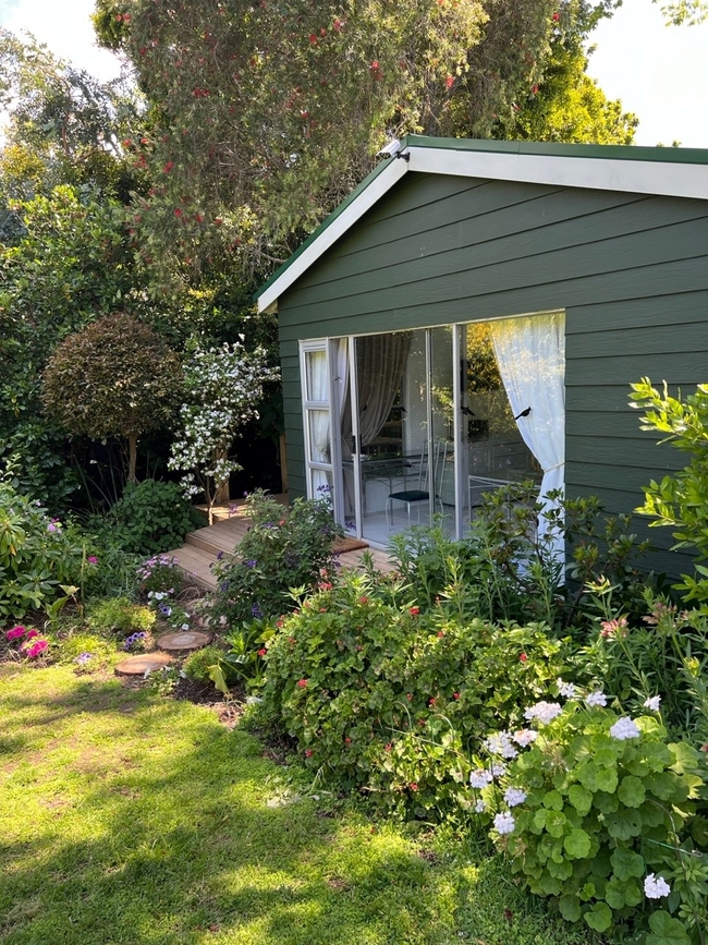This is a magical open plan living space hidden in its own leafy glen in the beautiful grounds of the main guest house at Avenue Torquay. Decorated in different hues of white, the Garden Cabana is a fully equipped self-catering cottage, which enjoys all the features of the establishment, and all of its beauty and tranquility, with full access to the garden and pool, and other amenities offered by the guesthouse. It has a private deck for out door eating and a large deck for private sunning. Open plan studio style cottage suitable for a single person seeking privacy or a couple. All wooden exterior: all white interior. Lovely outdoor decking area for chilling. Double bed with sumptuous linen. Fully equipped for catering: Microwave, fridge, plate cooker, mini oven, and plug ins. Living area has a couch and 2 easy chairs. Gas heater in Winter. Separate loo-room has space-age shower with light and sound. Fluffy towel, gowns and slippers, plus generous toiletry amenities. Drop-side dining table double as a desk. Hair dryer, iron and ironing board or use our laundry facility. Flat screen TV which swivels towards bed or lounge. DSTV hotel bouquet. Fibre WiFi. Fan and mosquito net in Summer.