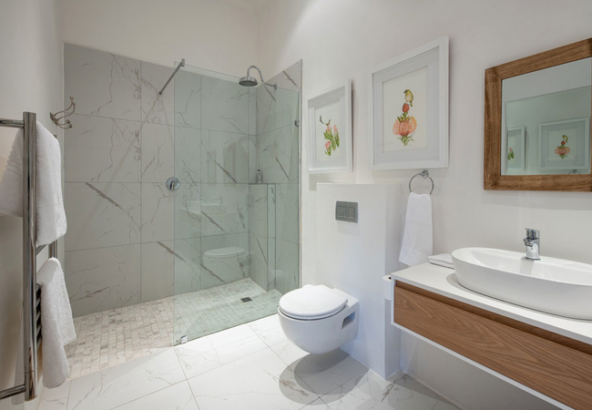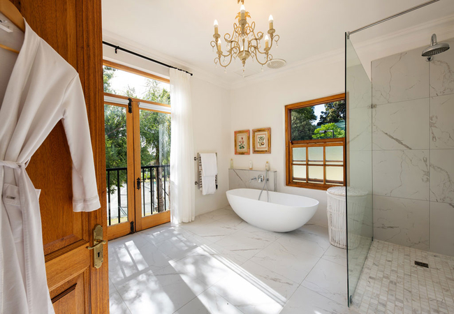 This Standard Room is furnished with an extra length King-size bed and the en-suite bathroom is equipped with a walk in shower, hand basin and WC. This room has views of the pool, garden and Table Mountain. French doors open onto the terrace. Free Wi-Fi and tea / coffee facilities are provided.