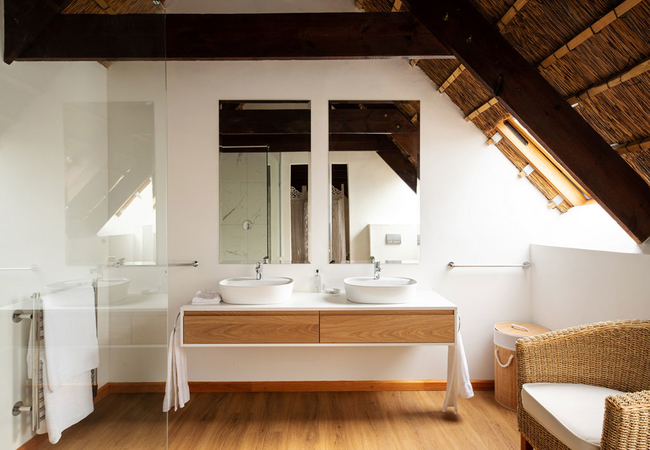 This large upstairs room is furnished with a split King-size bed. The en-suite bathroom has a walk in shower and double vanity, hand basins and WC. Free Wi-Fi and tea / coffee facilities are provided.