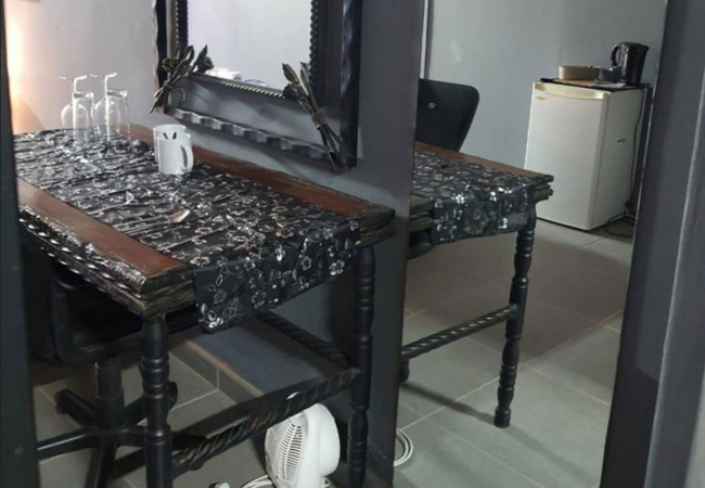 Comfort Quadruple Room is air-conditioned, sleeps four and is furnished with a double bed and two single beds. The en-suite bathroom is fitted with a corner bath, toilet and basin. The room has a kitchen fitted with a bar fridge, microwave, kettle, and a washing machine.