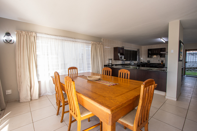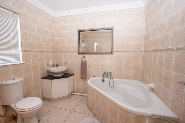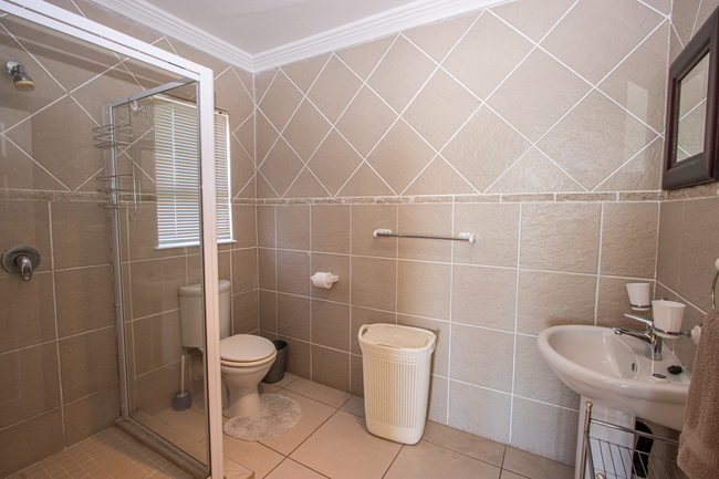Azriel 4 has three bedrooms. The main bedroom is furnished with a King-size bed and has a door leading to the top floor covered balcony. The en-suite bathroom is fitted with a bath, shower, toilet and basin. The second bedroom is furnished with a double bed and has a door leading to the upper balcony with distant sea views. The third bedroom is furnished with a double bed. The shared bathroom is fitted with a bath, shower, toilet and basin. The kitchen is fully equipped and includes a dishwasher and washing machine. The lounge has two seating areas and a dining area. There is a flatscreen TV with a DVD player. A sliding door leads onto the first level balcony with outdoor furniture and a braai. Off street parking is available.