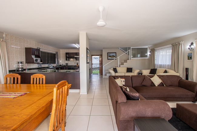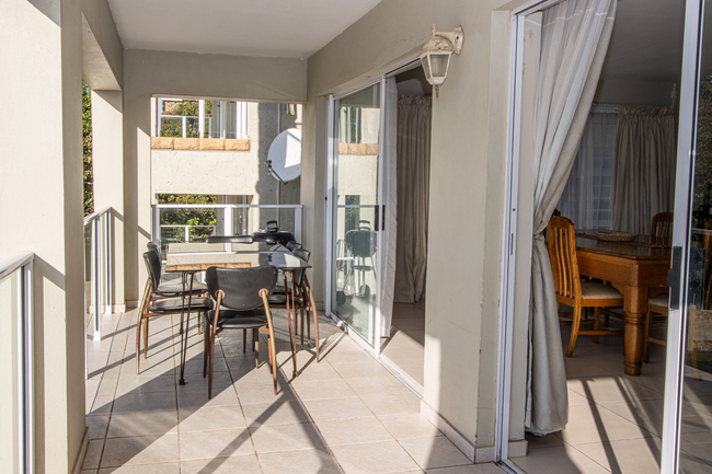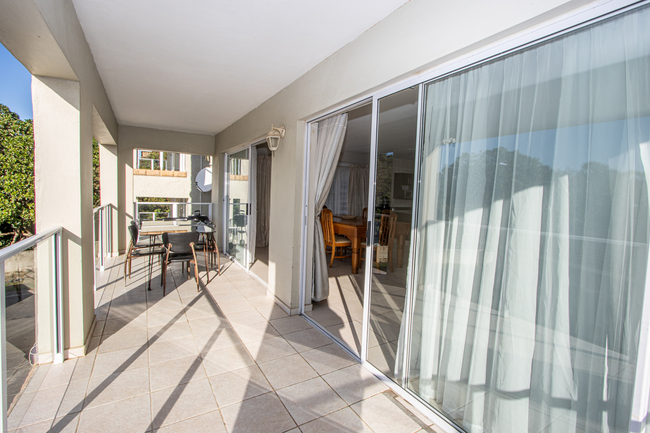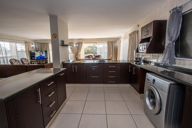 The kitchen is fully equipped and includes a dishwasher and washing machine. The lounge has two seating areas and a dining area. There is a flatscreen TV with a DVD player. A sliding door leads onto the first level balcony with outdoor furniture and a braai.