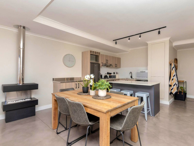 The kitchen flows seamlessly into a beautifully furnished living room where guests can relax on comfortable seating, watch television, enjoy the warmth of a fireplace, or share meals at the dining table. The apartment also offers free Wi-Fi throughout, and an inverter system provides peace of mind during periods of load shedding.