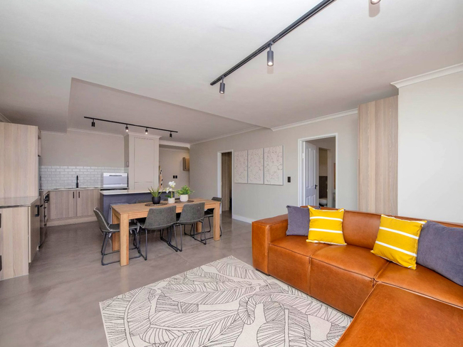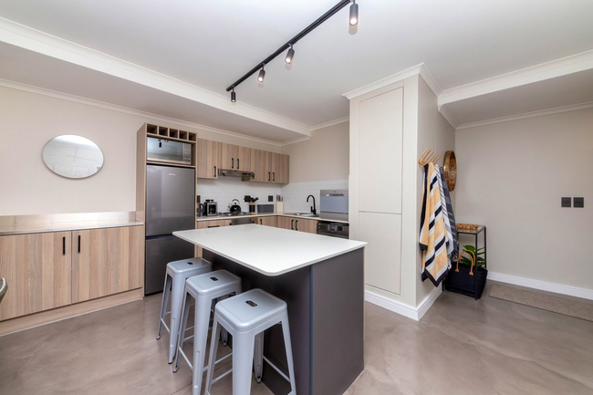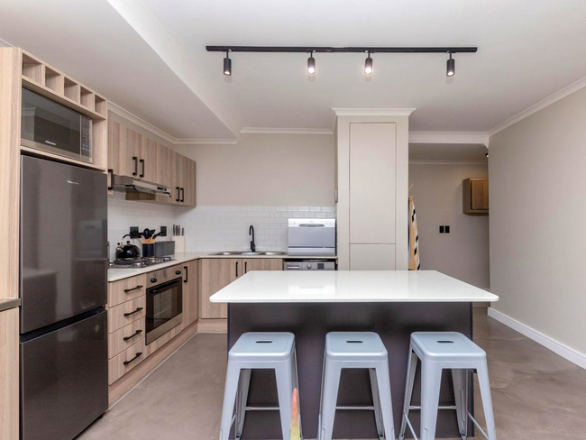 This stylish retreat accommodates up to four guests in two thoughtfully decorated bedrooms and a modern bathroom. The main bedroom features a king-size bed and a private en-suite fitted with a shower, basin, and toilet. The second bedroom is furnished with a queen-size bed and enjoys the convenience of a separate guest bathroom, also equipped with a shower, basin, and toilet. The open-plan kitchen has been designed with both function and style in mind. It is fitted with a fridge-freezer, stove, oven, microwave, cutlery, crockery, and tea- and coffee-making facilities. A central breakfast island with stools adds a welcoming touch, while a washing machine ensures practical convenience for longer stays. The kitchen flows seamlessly into a beautifully furnished living room where guests can relax on comfortable seating, watch television, enjoy the warmth of a fireplace, or share meals at the dining table. The apartment also offers free Wi-Fi throughout, and an inverter system provides peace of mind during periods of load shedding. Sliding doors from the living area open onto a private balcony, the perfect setting to savour a sundowner while listening to the rhythmic sound of the waves.