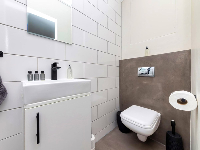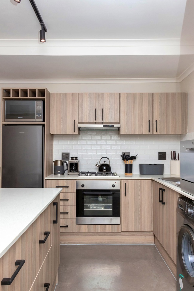The open-plan kitchen has been designed with both function and style in mind. It is fitted with a fridge-freezer, stove, oven, microwave, cutlery, crockery, and tea- and coffee-making facilities. A central breakfast island with stools adds a welcoming touch, while a washing machine ensures practical convenience for longer stays.