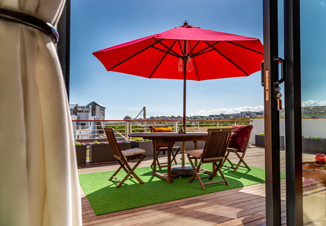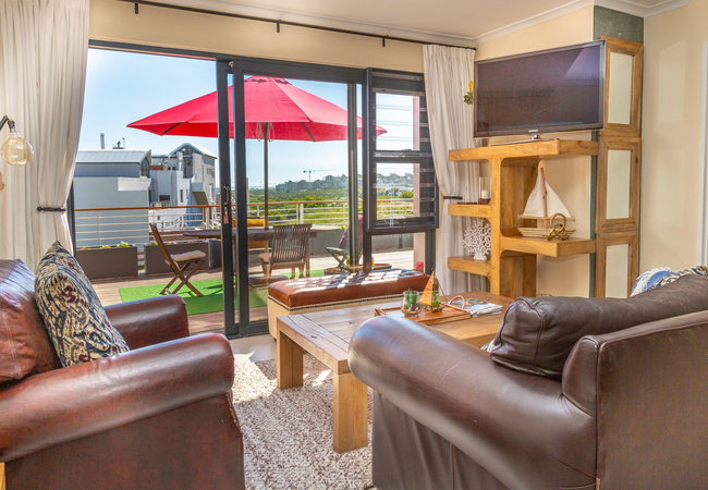 Guests have access to the balcony that leads out from the living area through sliding doors. Here there are splendid views of the surrounding area as well as outdoor furniture for guests to relax on. There is also built-in braai facilities and a large umbrella for those sunny days.