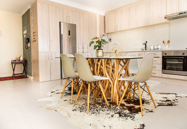 The open plan kitchen is fully equipped and consists of everything needed for your self catering stay. It includes a stove, oven, tea / coffee making facilities and a fridge / freezer. There is a dining table where guests are able to enjoy their meals. The cosy living area has comfortable couches, a coffee table and a flat-screen TV with DStv.