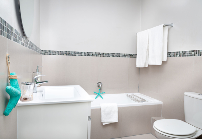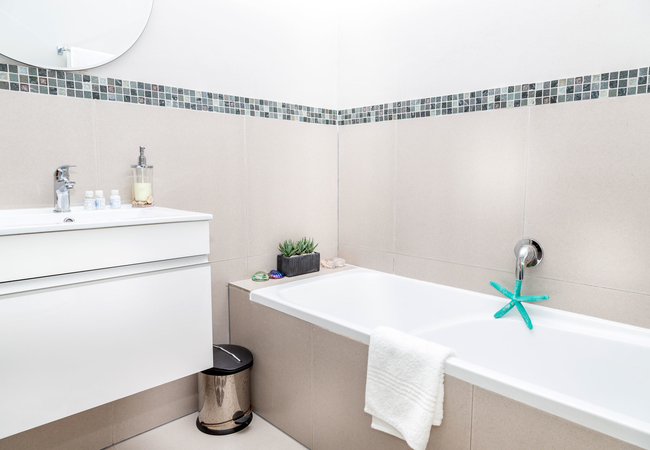 Azure 27 is a self catering apartment furnished with two bedrooms and one bathroom. Each of the bedrooms have a double bed and share a bathroom that is fitted with a bath, shower, basin and a toilet. Bed linen and bathroom towels are provided.
