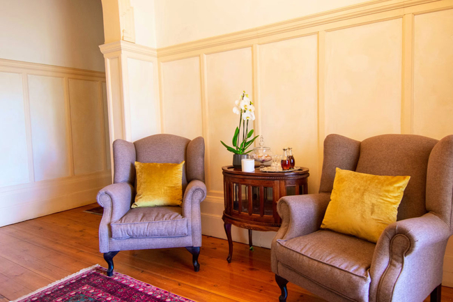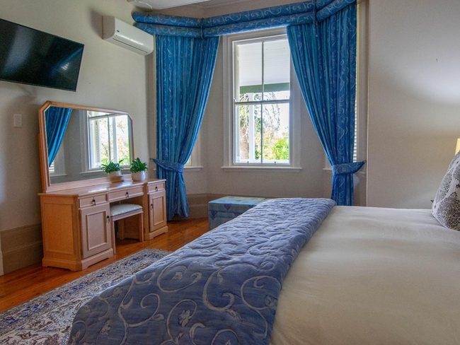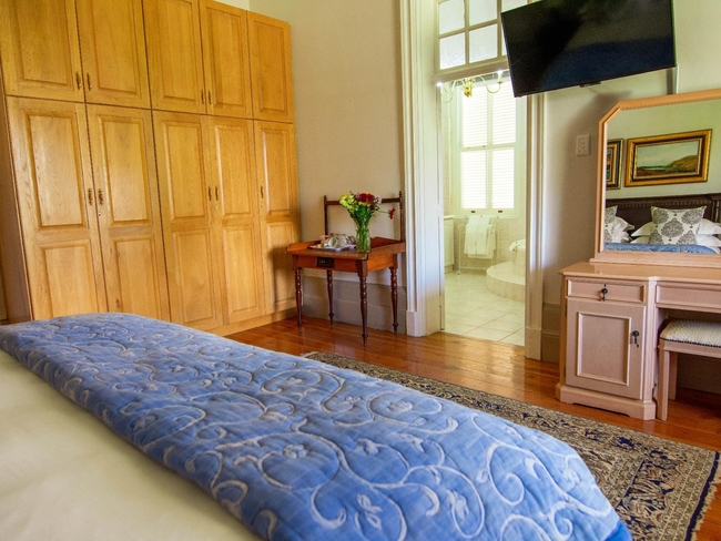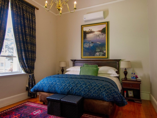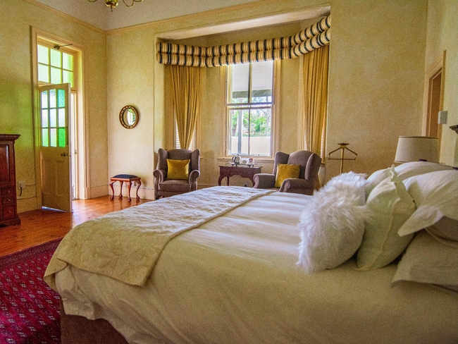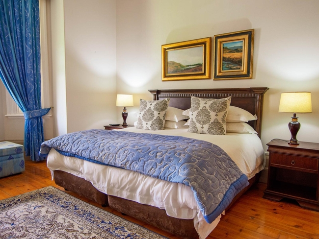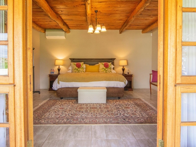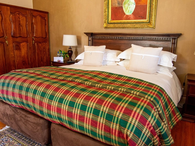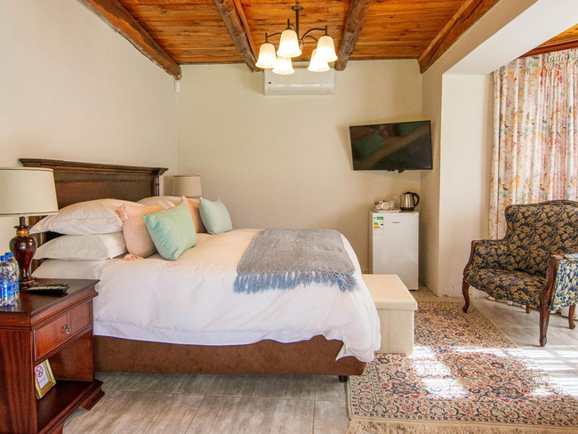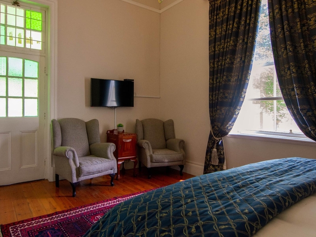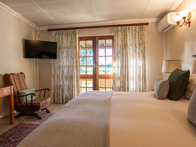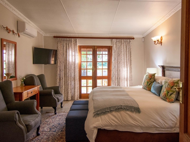 Located within the main house, this luxurious en-suite bedroom is thoughtfully designed and beautifully decorated to reflect a classic Victorian style. The suite features a king-size or twin bed arrangement and a spacious private bathroom with both a separate bathtub and shower, complemented by plush slippers, a hairdryer, and premium bathroom amenities. Guests can enjoy a range of modern comforts, including air conditioning, a ceiling fan, complimentary Wi-Fi, a flat-screen TV with DStv, a minibar, refrigerator, and coffee and tea-making facilities. The room also offers a sitting area and a desk, ideal for relaxation or work. Daily cleaning, turn-down service, and wake-up calls ensure a comfortable and personalised stay. This non-smoking suite also opens out onto a private patio, balcony, or terrace, offering a peaceful space to unwind in the serene surroundings.