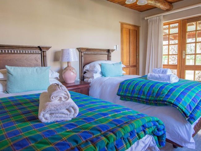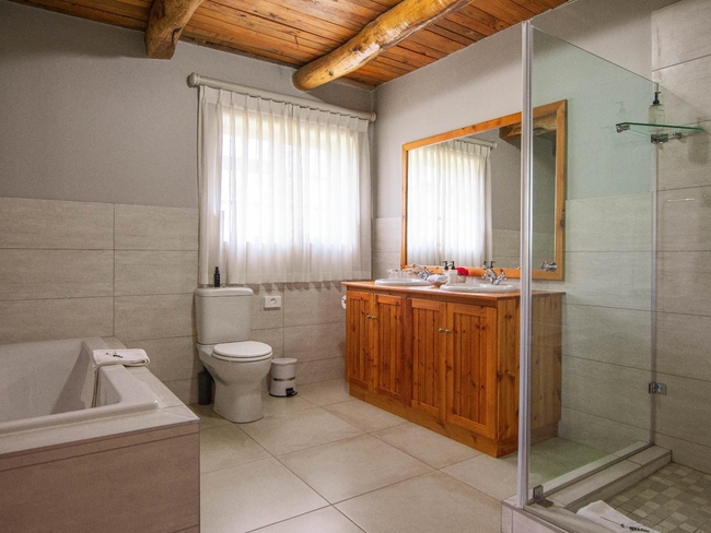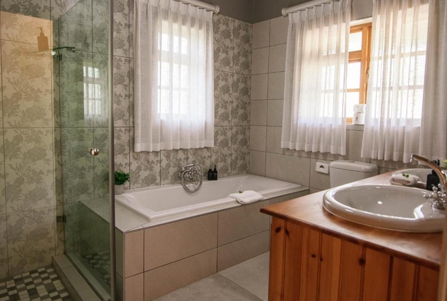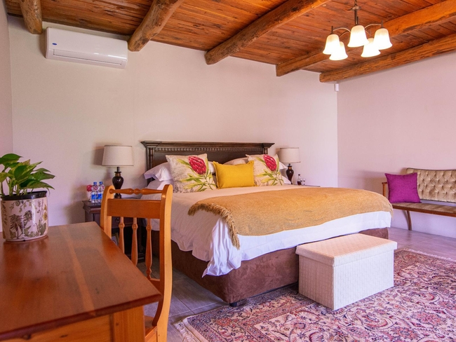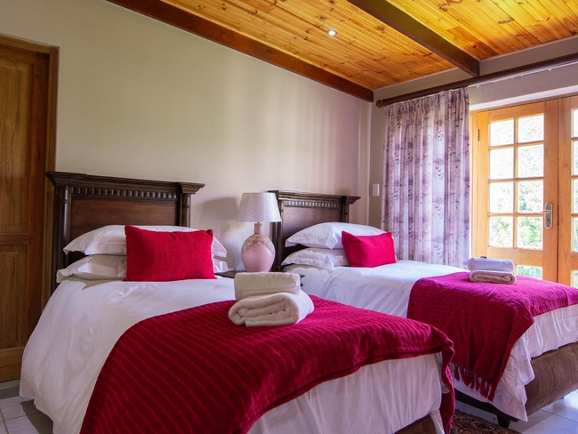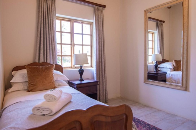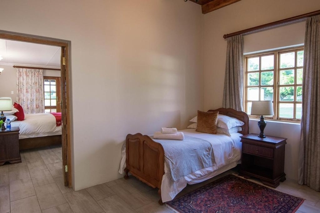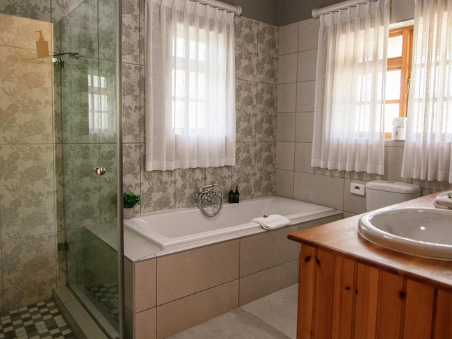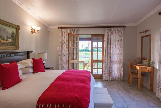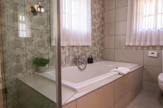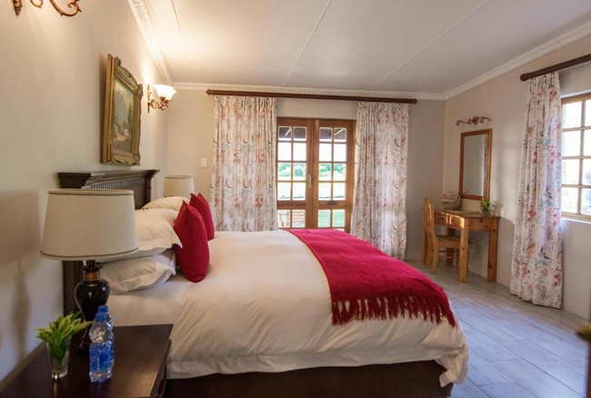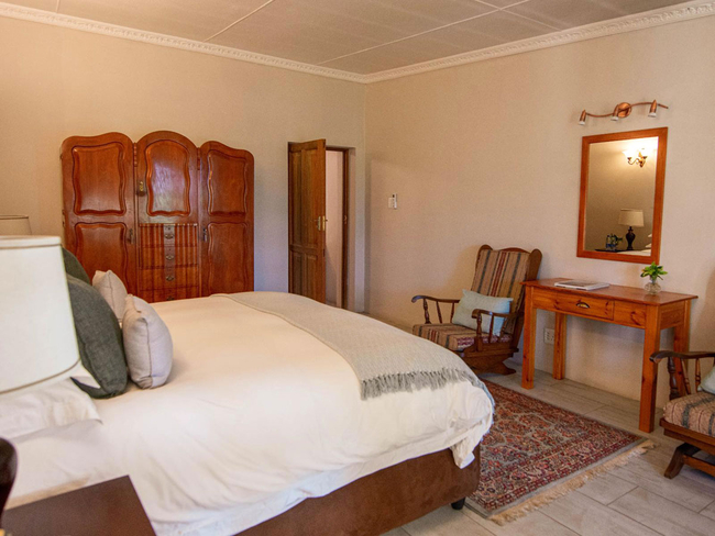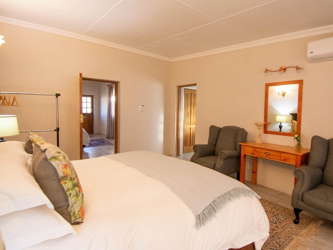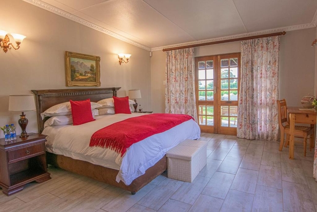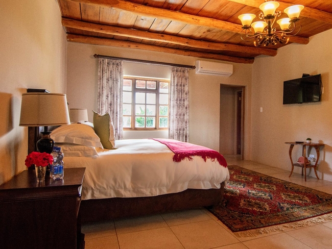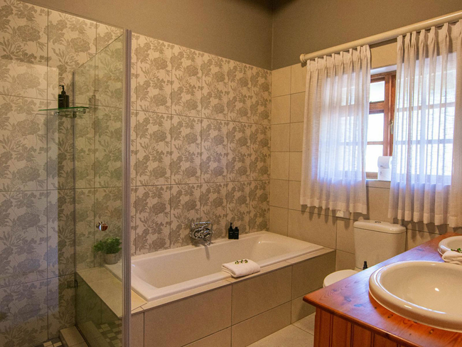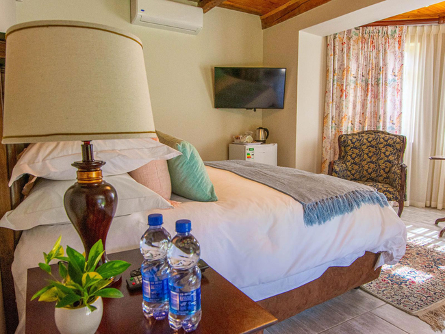 This elegant en-suite bedroom is designed to accommodate two guests in either a king-size or twin bed configuration. The spacious bathroom features both a separate bathtub and shower, along with a hairdryer and premium bathroom amenities for added comfort. Large windows offer peaceful views of the surrounding farmlands and garden, creating a tranquil retreat. The room is well-equipped with air conditioning, a heater, a sitting area, a TV with DStv, and complimentary Wi-Fi. Guests also have access to tea and coffee-making facilities, a bar fridge, a safe, and a range of thoughtful touches including daily cleaning service and wake-up calls. This non-smoking room provides a comfortable and restful stay, perfect for couples seeking relaxation in a scenic setting.