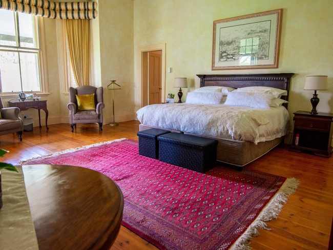 This elegant en-suite room is designed to accommodate two guests, featuring a luxurious king-size or twin bed configuration. The spacious bathroom includes both a separate shower and bathtub, along with premium guest amenities, bathrobes, slippers, and a hairdryer for added comfort. Large windows offer beautiful views of the surrounding farmlands, while thoughtful in-room features include air conditioning, a ceiling fan, a fireplace, and a sitting area for relaxation. Guests can enjoy modern conveniences such as a flat-screen TV with DStv, complimentary Wi-Fi, and a desk for work or writing. Additional comforts include a minibar, refrigerator, coffee and tea-making facilities, a safe, and a range of personalised services including wake-up calls, daily cleaning, and turndown service. The room is non-smoking and opens onto a private patio, balcony, or terrace—perfect for enjoying the tranquil countryside setting.