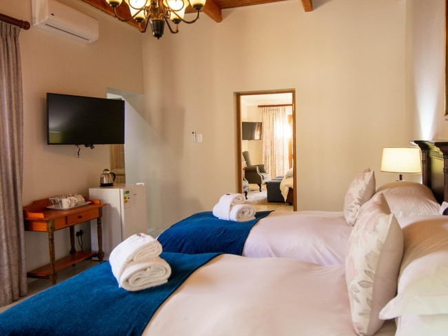 This spacious Luxury Family Suite features two beautifully appointed bedrooms, each furnished with twin beds that can be converted into king-size beds upon request. The rooms share a generous bathroom that includes both a separate bathtub and shower, as well as thoughtful touches such as bathrobes, slippers, a hairdryer, and premium bathroom amenities. Ideal for families or friends travelling together, the suite offers a comfortable sitting area, air conditioning, ceiling fan, and even a fireplace for added warmth and ambiance. Guests can enjoy complimentary Wi-Fi, a flat-screen TV with DStv, and in-room conveniences such as a minibar, refrigerator, and coffee and tea-making facilities. A desk, safe, and a range of personalised services - including wake-up calls, daily cleaning, and turn-down service - further enhance the experience. This non-smoking suite also opens onto a private patio, balcony, or terrace, providing a peaceful spot to unwind and take in the surrounding views.