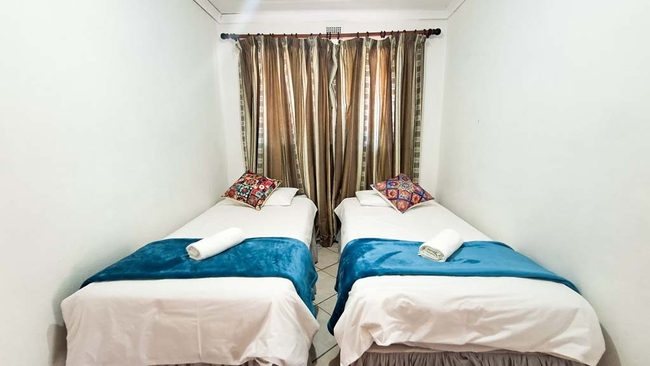 Bali Hai House can accommodate up to 8 guests (4 adults and 4 kids), and has three bedrooms, three bathrooms, and an open-plan kitchen, dining and living area. The first bedroom is furnished with a double bed and has an en-suite bathroom fitted with a bath, a toilet and a washbasin. The second bedroom has a double bed and a shower en suite with a toilet and washbasin. The third bedroom is furnished with two single beds. The third bathroom is fitted with a shower, a toilet and washbasin. Guests must bring their own towels. The kitchen is well-equipped for self-catering with a stove and oven, fridge-freezer, microwave, kettle and toaster. There is also a laundry room with a washing machine, a tumble-dryer and a chest freezer. The dining area contains a round 6-seater dining table and chairs and a ceiling fan. The lounge has comfortable seating, a ceiling fan, and a TV with limited open view channels. Guests need to bring their own DStv decoder and smart card if they want DStv. The living area opens to a veranda with a built-in braai. There is a garage and additional parking undercover parking.