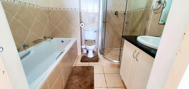 The main bedroom is furnished with a double bed and includes an en-suite bathroom complete with a shower, bath, toilet, and basin. The second bedroom features a double bed, while the third bedroom contains two single beds, with both rooms sharing a fully equipped bathroom that includes a shower, bath, toilet, and basin.