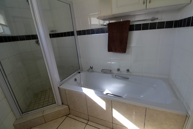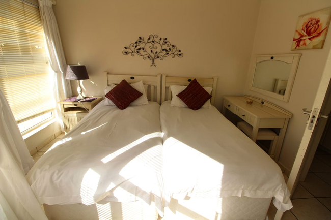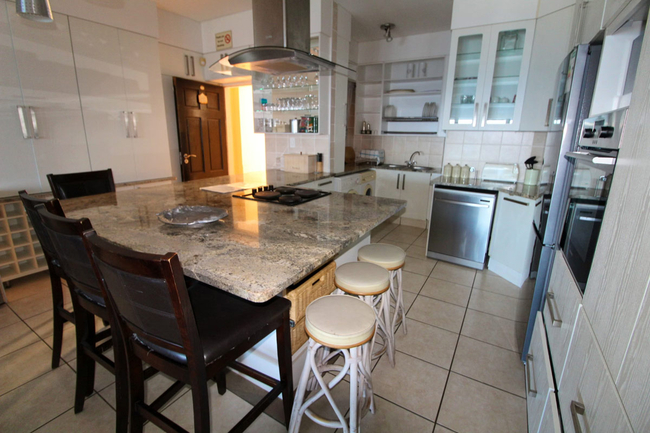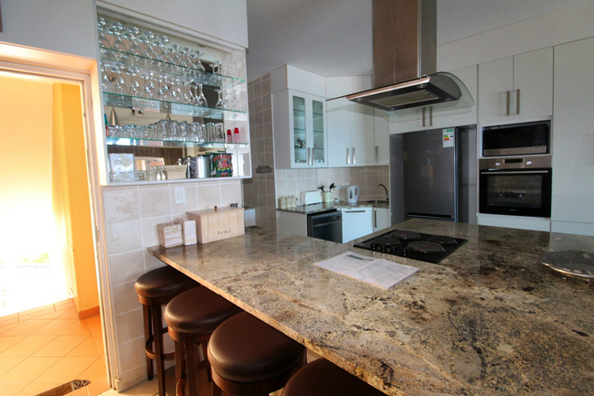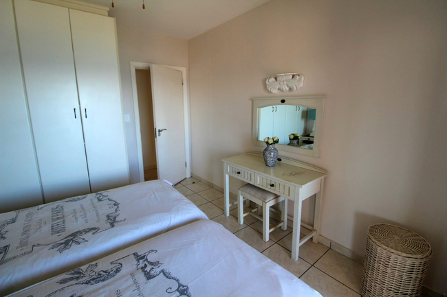 The apartment comfortably accommodates up to eight guests and features four bedrooms, three bathrooms, and a spacious open-plan kitchen and living area designed for relaxed holiday living. The main bedroom is furnished with a double bed and includes a private en-suite bathroom fitted with both a bath and a shower. The second bedroom offers two single beds and has its own en-suite shower, toilet, and washbasin. The third and fourth bedrooms are each furnished with two single beds and share a well-appointed bathroom comprising a bath, toilet, and washbasin. The kitchen is fully equipped for self-catering and includes a stove, oven, fridge-freezer, microwave, as well as all necessary cutlery and crockery. Additional conveniences include a dishwasher, washing machine, and tumble dryer, while a breakfast bar with stools provides a practical space for casual meals. The air-conditioned living area is comfortably furnished with a lounge suite and a flat-screen television. Guests are required to bring their own emergency lighting or candles, along with a DStv decoder and card or an Openview decoder and the necessary connection cables, as no decoder is provided in the apartment. Sliding doors from the living area open onto a pleasant patio furnished with outdoor seating and a gas braai, making it ideal for relaxed outdoor dining. The apartment includes one allocated parking bay, with additional visitor parking available on a first-come, first-served basis. Guests also have access to the communal swimming pool within the Balooga complex.