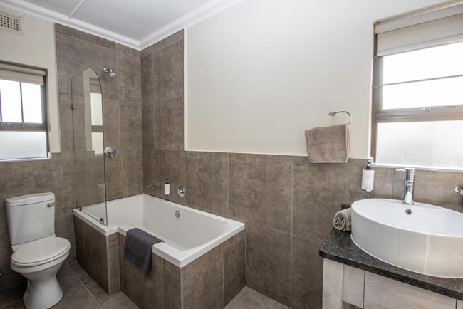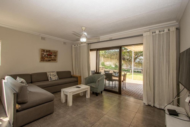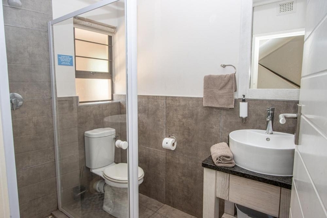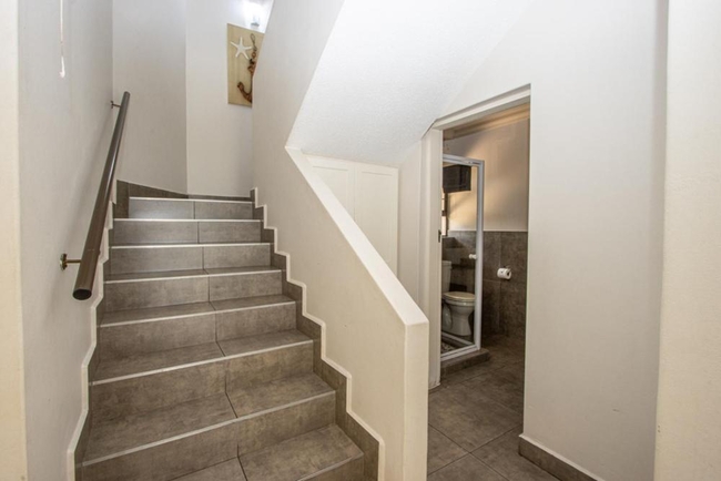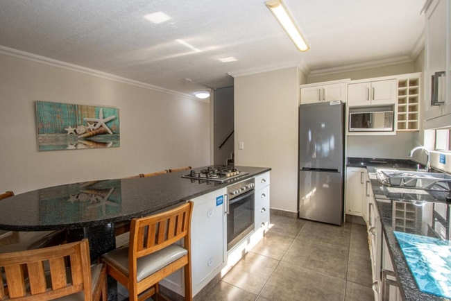 Unit A5 is a duplex chalet featuring 3 bedrooms, one furnished with a double bed and the other 2 single beds. The unit has 2.5 bathrooms, one with a shower over the bath, basin, and toilet the other with just a shower, basin and toilet. The half bath is fitted with only a toilet and basin. The chalet includes a fully equipped kitchen with a gas hob and breakfast bar, an open-plan lounge area with a TV, and a verandah with a braai facility. Covered parking is available for this unit.