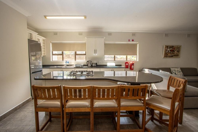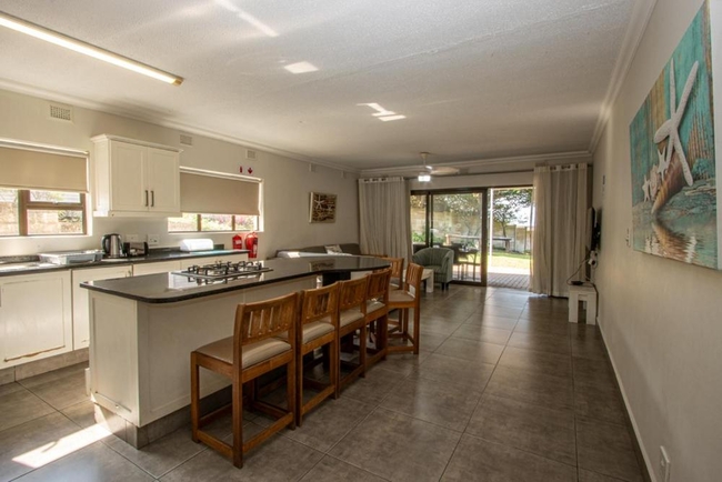 The chalet includes a fully equipped kitchen with a gas hob and breakfast bar, an open-plan lounge area with a TV, and a veranda with a braai facility.