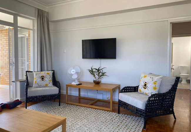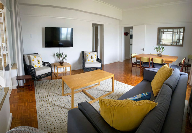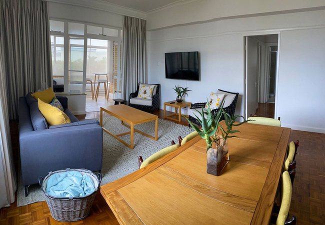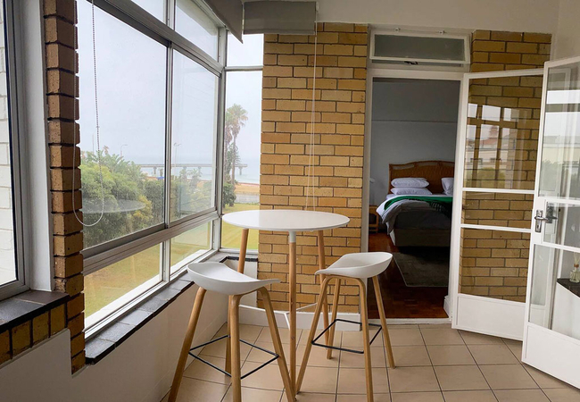 Bandle at The Boardwalk is a self catering holiday apartment in Summerstrand sleeping four guests. The main bedroom is furnished with a King-size bed and the second bedroom is furnished with two single beds. The bathroom is fitted with a shower, toilet and basin. There is an additional guest toilet. There is a comfortable living area with a seating, a TV with Netflix, Wi-Fi and a dining table. The kitchen is fully equipped for your self catering stay and boasts a dishwasher and a washer / dryer for convenience. The path from inside the guest entrance to the room has no stairs, steps, or thresholds higher than 2 inches. Outside there is an enclosed balcony with lovely views. Secure off street parking is provided.