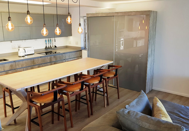 The open-plan living area offers a dining table with seating where guests can enjoy their meals together and a TV with selected DStv channels.