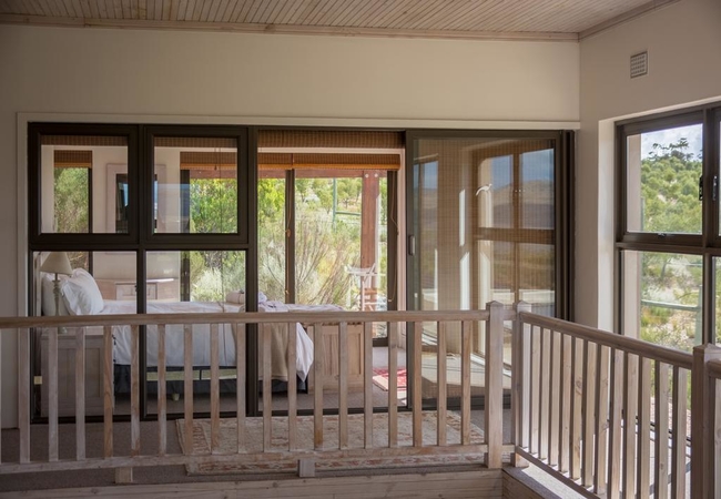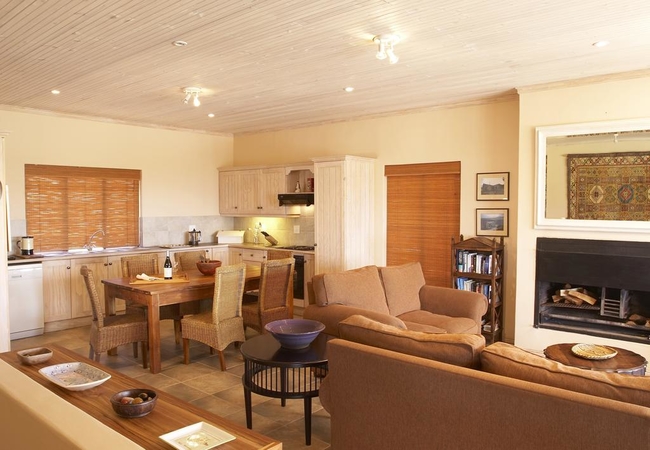 Blue Crane Villa has two en-suite double bedrooms (one with shower only) and one en-suite twin bedded room. The spacious living room leads to a well-equipped kitchen. The villa has an eco-friendly wood fire hot tub, pool and gazebo with views across the valley and the Kogelberg Nature Reserve.
