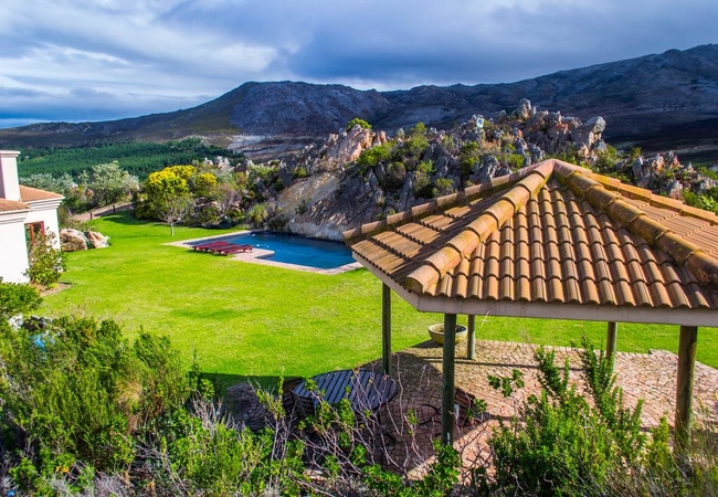 Dove Villa can accommodate 6 people in total, in three large en-suite bedrooms. Two bedrooms have a door that leads to the front patio, overlooking the swimming pool, vineyards and mountains. There is a spacious open plan living area and fully equipped self catering kitchen. An undercover Jacuzzi is available for private use. Various braai areas are available as well as a fire place in the living area.