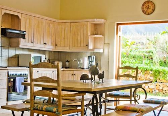 This split-level three bedroom(en-suite with shower and bath) villa has a spacious open plan living room with DStv and log fire, dining area and well equipped open-plan kitchen that leads onto the dining veranda. Braai facilities provided on the verandas, its own Jacuzzi and swimming pool, which have views over the farm's vineyards, Walker Bay and the Kogel valley.