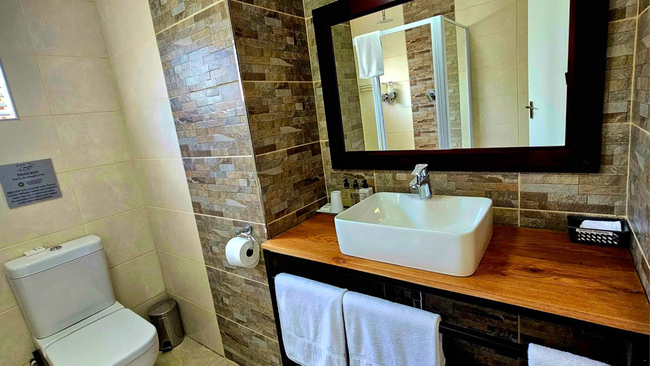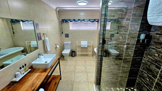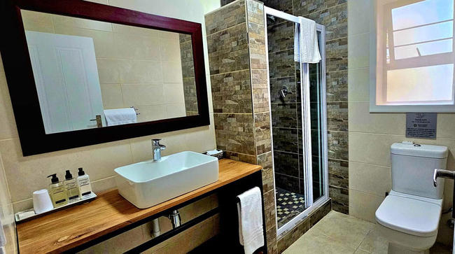 The suite has two air-conditioned bedrooms and a shared bathroom with a shower only. It is equipped with a queen-size bed and two single beds. The room is equipped with a TV with selected DStv channels, DVD, bar fridge, hair dryer and tea and coffee-making facilities. microwave and Mini Bar
