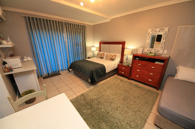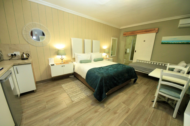 This room features a private entrance, a queen-size and Single bed and an en-suite bathroom fitted with a shower, toilet and basin. The room is equipped with a large flat screen TV with selected DStv channels, CD/DVD player, free Wi-Fi, fridge and coffee/tea station, microwave and mini bar..
