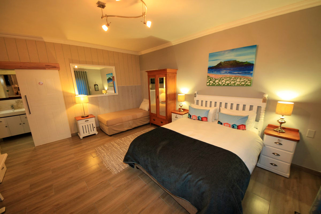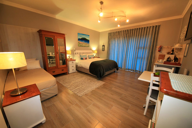 This room features a private entrance, a queen-size and Single bed and an en-suite bathroom fitted with a shower, toilet and basin. The room is equipped with a large flat screen TV with selected DStv channels, CD/DVD player, free Wi-Fi, fridge, microwave, coffee and tea station in the room and a private patio.