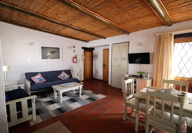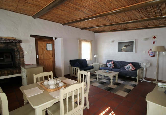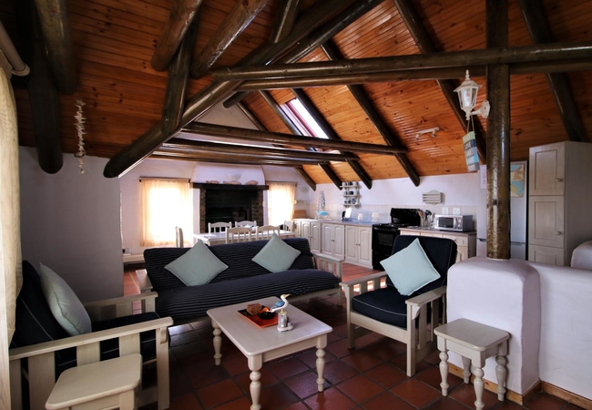 This one bedroom fisherman's cottage. The bedroom has a king-size bed. An additional single bed is available in the lounge area. This cottage has a bathroom with a shower over the bath, an open plan lounge / dining / kitchen area. The inside braai / come fire place is great for romantic winter evenings around the fire and the private courtyard has it own outside braai, ideal for those hot summer days.