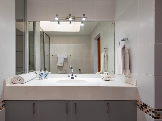 Beach2Anchor is a self catering holiday home in Gordons Bay with four bedrooms and three bathrooms and is built over four levels. Enter at the ground level; proceed up to the living area, where you can enjoy open plan dining and sitting room with a well-appointed galley kitchen. Looking out at the sea from the kitchen gives you the distinct impression that you may be on a boat. The apartment has excellent Wi-Fi on all levels and air conditioning to cool the entire space. A kids room, also called the Rhino room, is furnished with a fabulous big bunk bed and indoor BBQ entertainment area can be found on this level. Up another level brings you to the bedrooms and two more bathrooms fitted with a bath and shower. The Elephant room is furnished with a Queen-size bed, the Buffalo room has air-conditioning and is furnished with a Queen-size bed. The Lion room (master bedroom) sleeps two and is furnished with a King-size bed. The master bedroom boasts a private balcony with awesome sea views, en-suite bathroom fitted with a bath, shower, toilet, basin and ceiling to floor mirrored closets and air-conditioning.