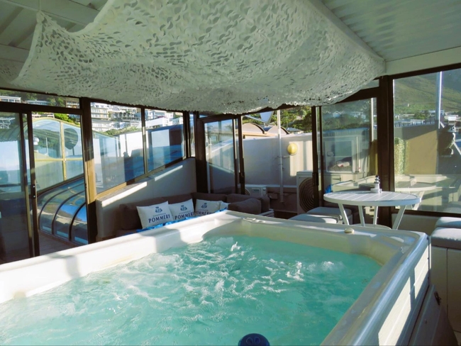 The upper level is certainly the piece de resistance. Here you will find a Jacuzzi tub with outstanding views across the beach and bay, clear views of Table Mountain, a large swivel umbrella and chase loungers for tanning.