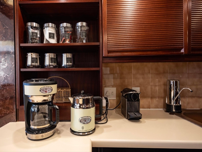 Enter at the ground level; proceed up to the living area, where you can enjoy open plan dining and sitting room with a well-appointed galley kitchen. Looking out at the sea from the kitchen gives you the distinct impression that you may be on a boat.