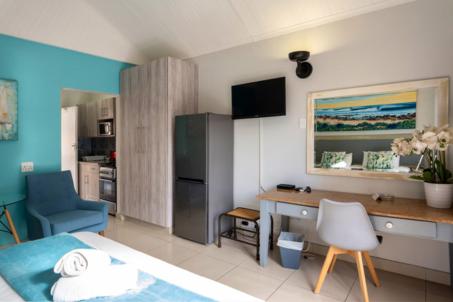 There are 4 of these rooms. The rooms are suited to accommodate 3 guests and come equipped with a double bed and a single bed and an en-suite bathroom fitted with a shower, toilet and basin. Other facilities include a kitchenette with crockery, cutlery, pots, pans, microwave, 2-plate stove with small oven, fridge, bar fridge and a TV in the sitting area.