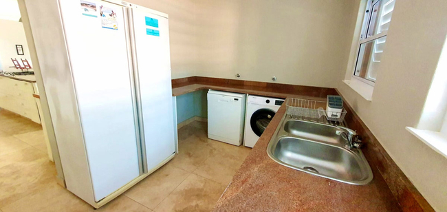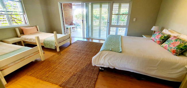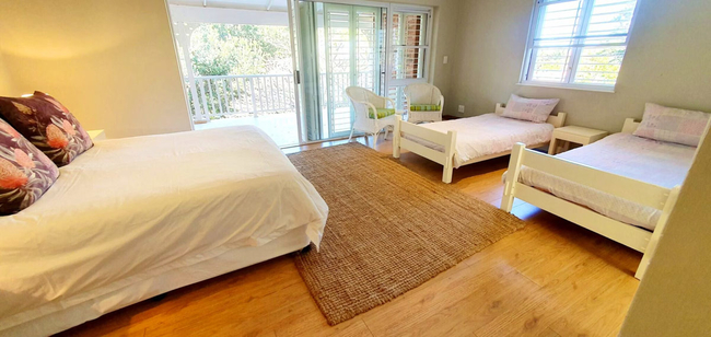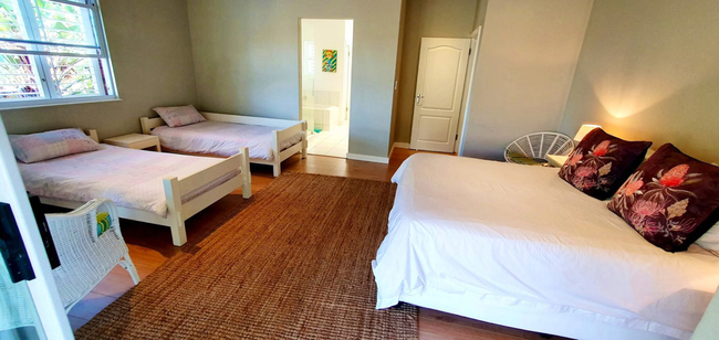 Beach Haven is an elegant colonial-style villa situated in Ramsgate. Tastefully decorated, it provides three well-appointed bedrooms and three bathrooms, comfortably sleeping up to 10 guests. The villa enjoys direct access to the beach through a secure gate and a short, scenic pathway, making it ideal for beach enthusiasts. Upstairs, guests will find three spacious bedrooms. The first and third bedrooms are en-suite, each furnished with a double bed and two single beds, while the central bedroom contains two single beds. The first en-suite bathroom features a bath, shower, toilet, and basin, while the second en-suite is fitted with a shower, toilet, and basin. Both bathrooms are modern, generously sized, and include built-in cupboards. An additional bathroom with a shower, basin, and toilet is also available. All bed linen and bath towels are provided, leaving guests only needing to bring their beach towels. The open-plan kitchen is contemporary and fully equipped for self-catering, including a dishwasher, washing machine, and tumble dryer in the scullery. A bar area enhances the functionality of the space. The lounge opens onto a large patio furnished with comfortable outdoor seating and a built-in braai. The property is supplied with unlimited fibre Wi Fi for uninterrupted entertainment and features a UPS system to ensure continued electricity supply during loadshedding. Beach Haven offers the perfect balance of accessibility and tranquility. Guests can easily reach local beaches, restaurants, and shopping, while still enjoying a peaceful retreat surrounded by nature. Occasionally, a family of small blue duikers, Africa's smallest antelope known as "Ipiti," can be spotted in the garden.