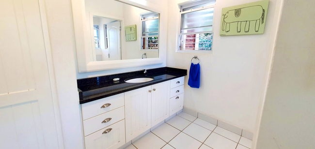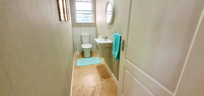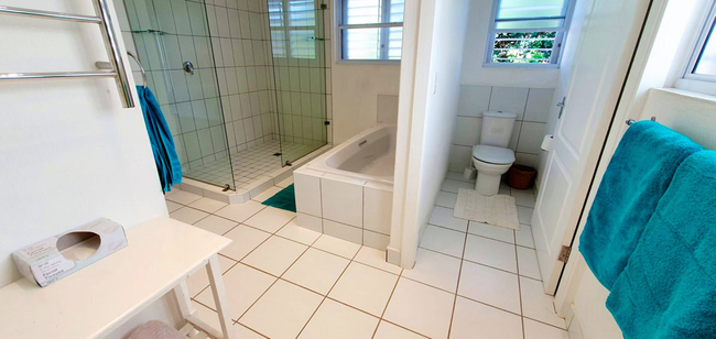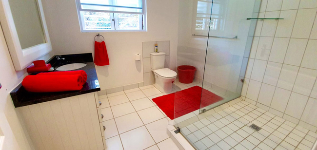 The first en-suite bathroom features a bath, shower, toilet, and basin, while the second en-suite is fitted with a shower, toilet, and basin. Both bathrooms are modern, generously sized, and include built-in cupboards. An additional bathroom with a shower, basin, and toilet is also available. All bed linen and bath towels are provided, leaving guests only needing to bring their beach towels.