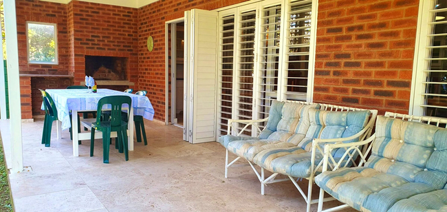 The open-plan kitchen is contemporary and fully equipped for self-catering, including a dishwasher, washing machine, and tumble dryer in the scullery. A bar area enhances the functionality of the space. The lounge opens onto a large patio furnished with comfortable outdoor seating and a built-in braai.